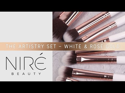Stand out from the crowd with Niré’s most exclusive brush collection — the Rose Gold & White Artistry Set. Featuring limited edition white handles and rose gold ferrules, our multi-award winning collection of pro make-up brushes contains 7 classic brushes for the eyes, 5 for the face, and a bonus Niré Blending Sponge.